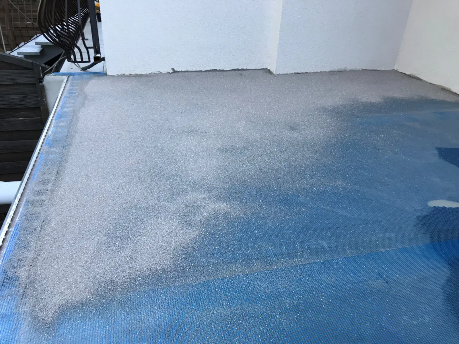 Wylej żywicę na beton. Do rozprowadzenia użyj gumy z wycięciami v-kształtnymi. Rozłóż siatkę mapenet 150, użyj wałka, aby ją zatopić w żywicę i ustabilizować.